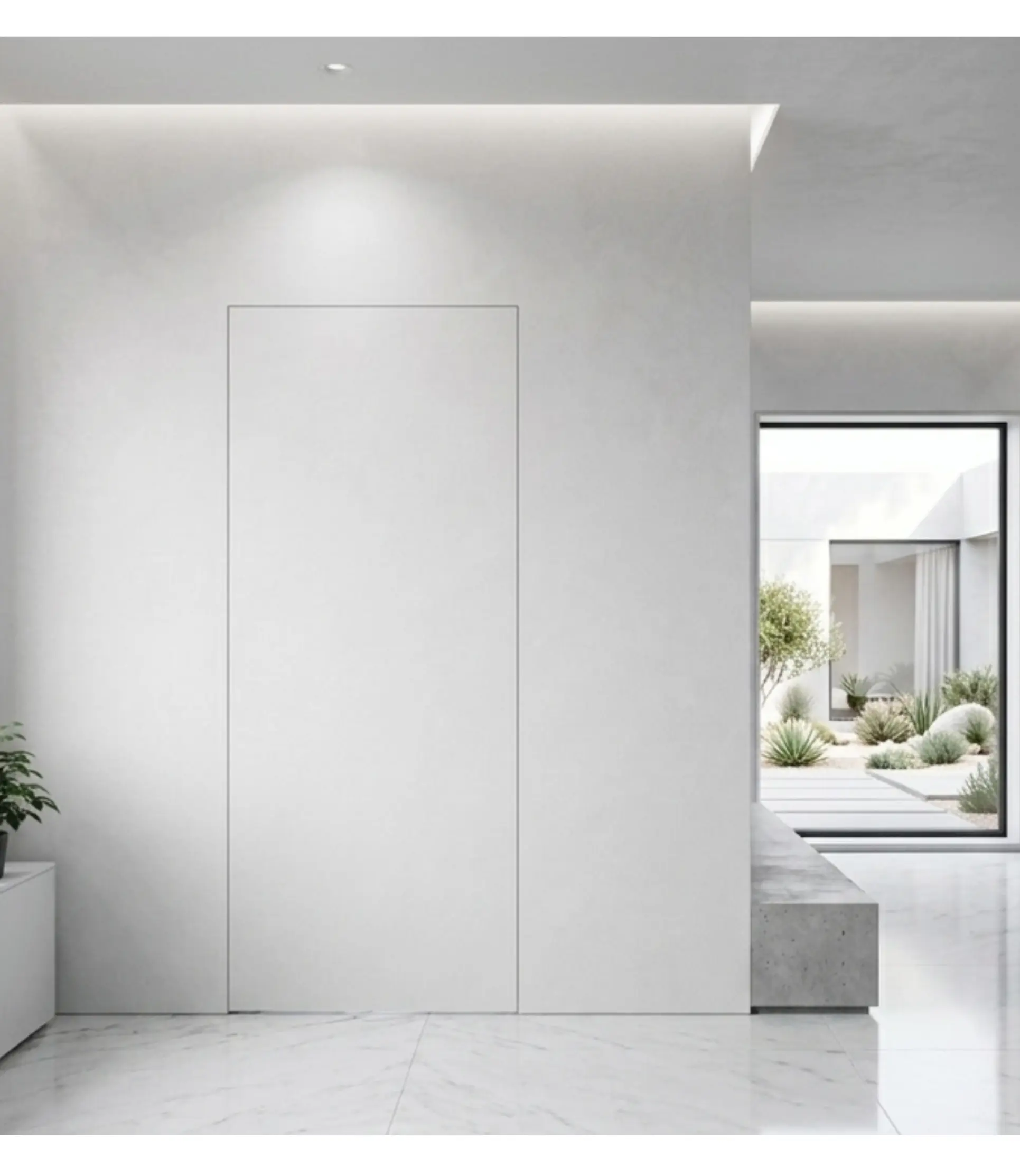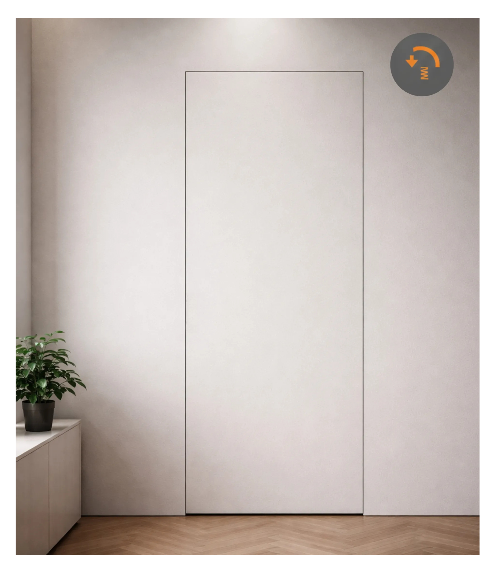 Skrzydło drzwiowe jest całkowicie zlicowane ze ścianą, dzięki czemu po zamknięciu staje się niemal niewidoczne. Model został zaprojektowany z myślą o malowaniu, tapetowaniu, lakierowaniu lub pod okładziny (wersja otwierana do wewnątrz), co pozwala idealnie dopasować drzwi do aranżacji wnętrza.