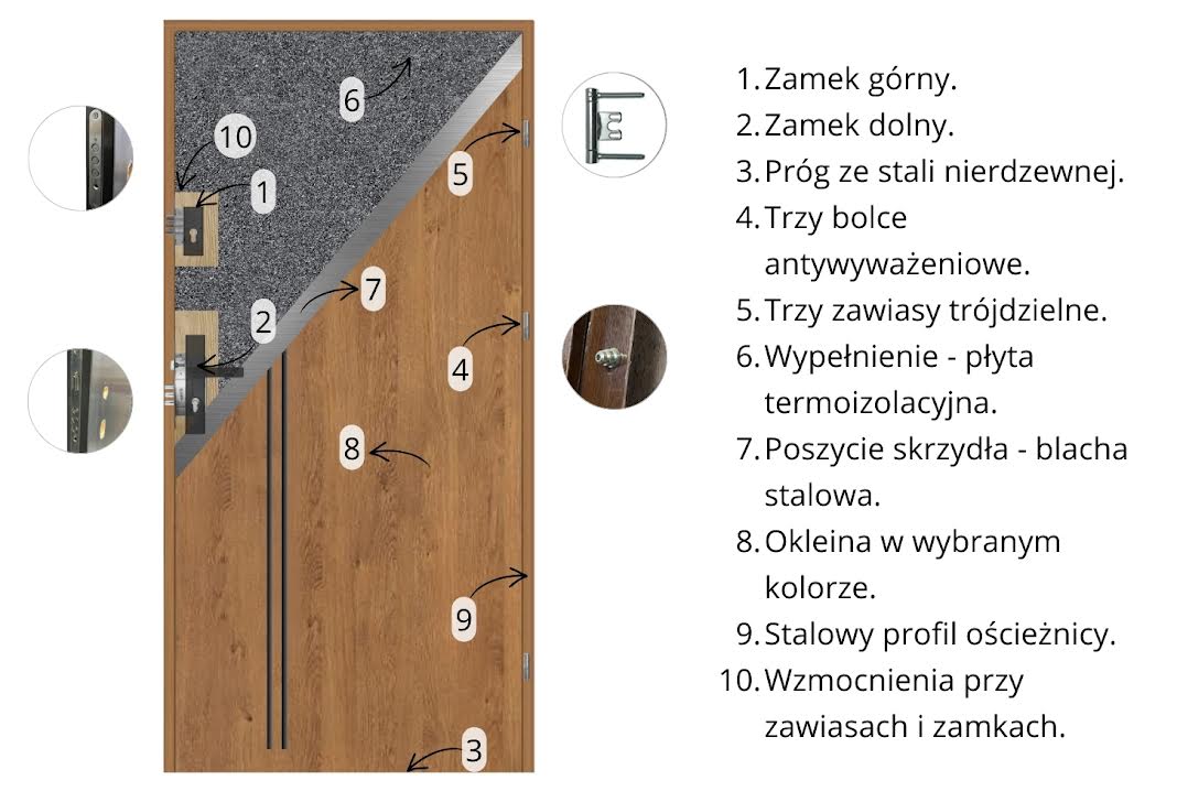 Nowoczesne drzwi zewnętrzne ocieplane o grubości 68 mm produkowane w Polsce. Grubość skrzydła oraz jego konstrukcja pozwoliła na osiągnięcie satysfakcjonującego współczynnika izolacyjności akustycznej i cieplnej.