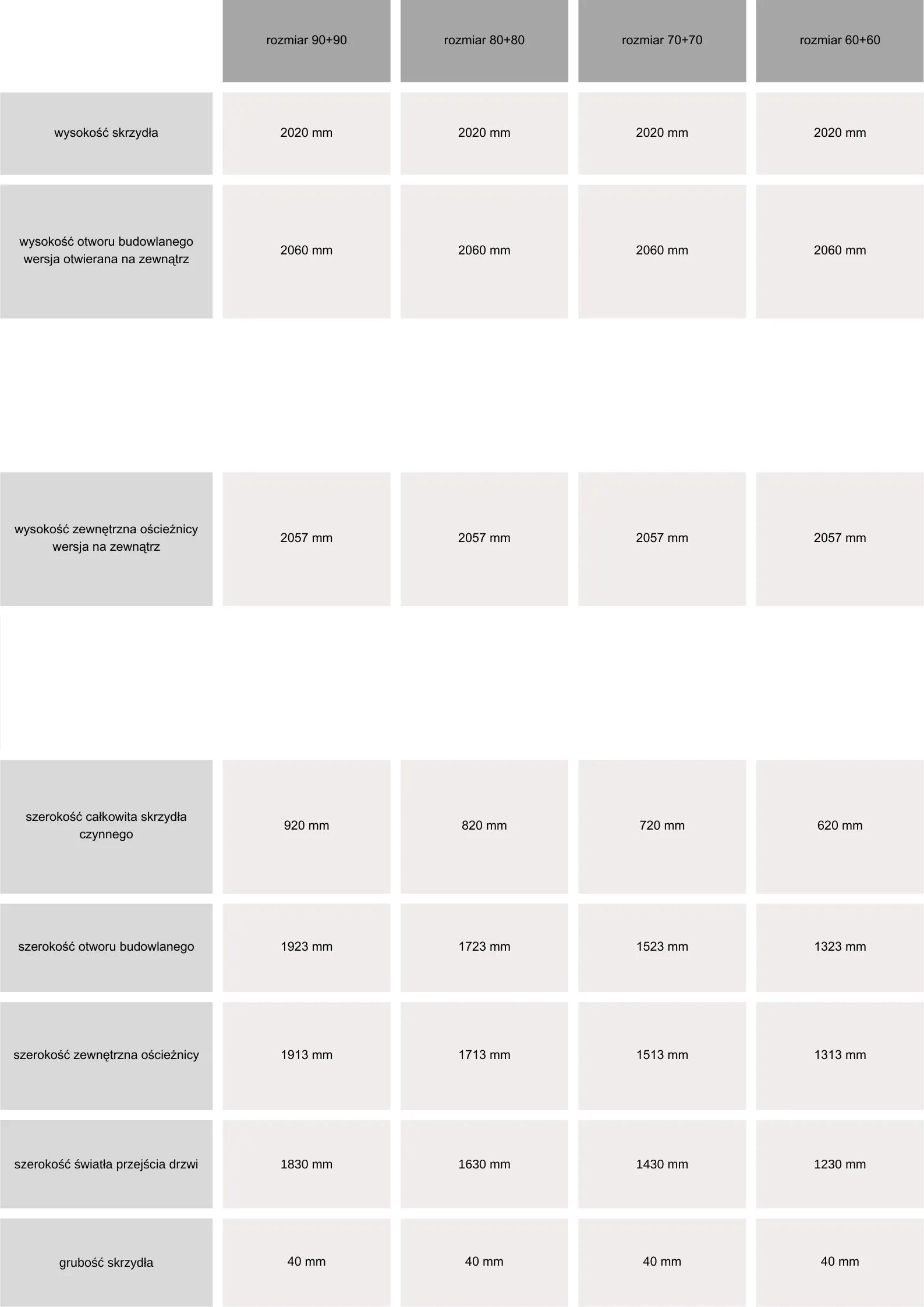 Dostępne rozmiary drzwi:
