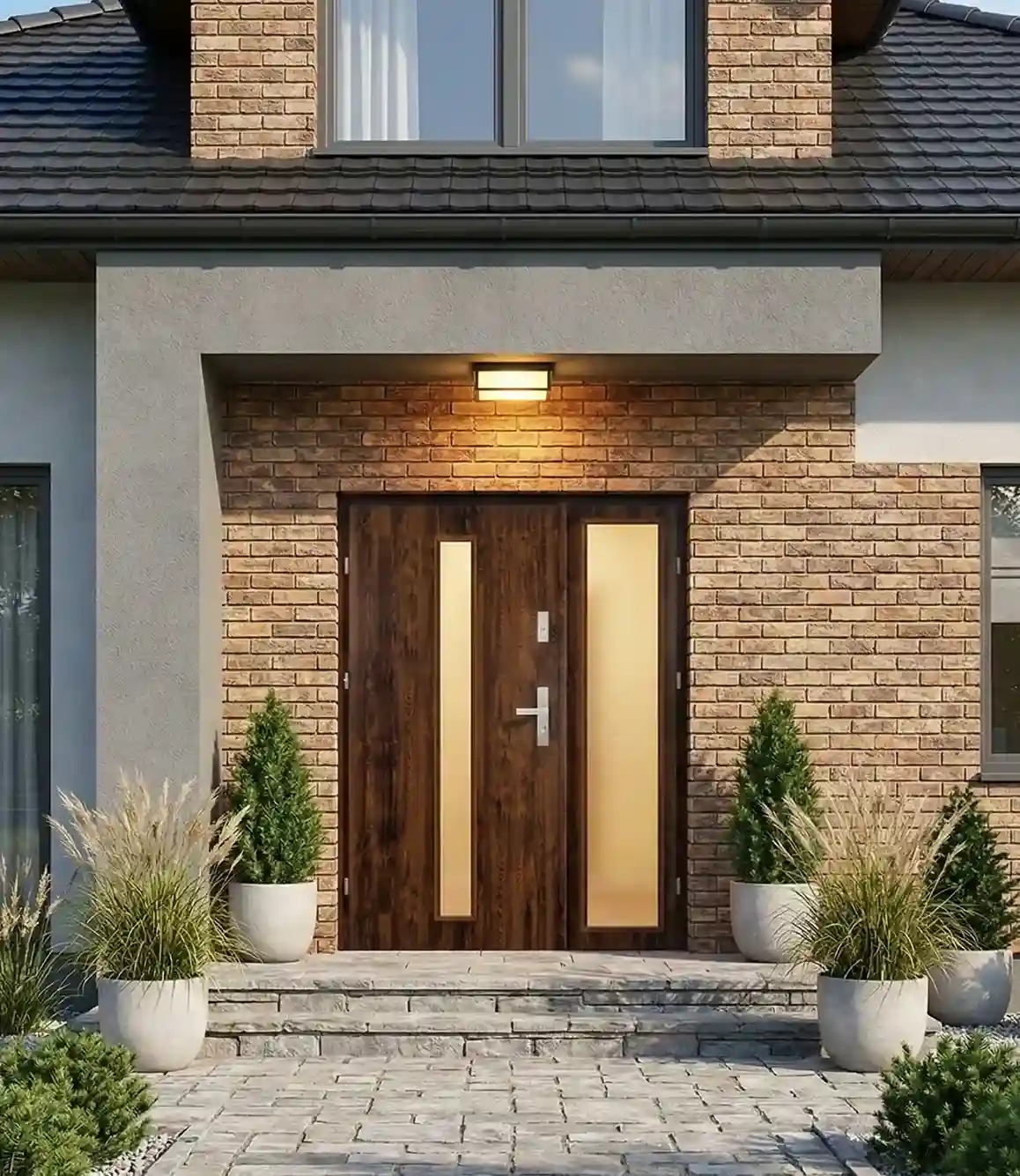 Eleganckie wejście w wielkim stylu – drzwi zewnętrzne z dwoma otwieralnymi skrzydłami.