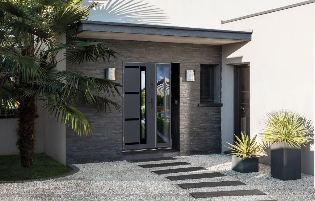 Eleganckie wejście w wielkim stylu – drzwi zewnętrzne z dwoma otwieralnymi skrzydłami.