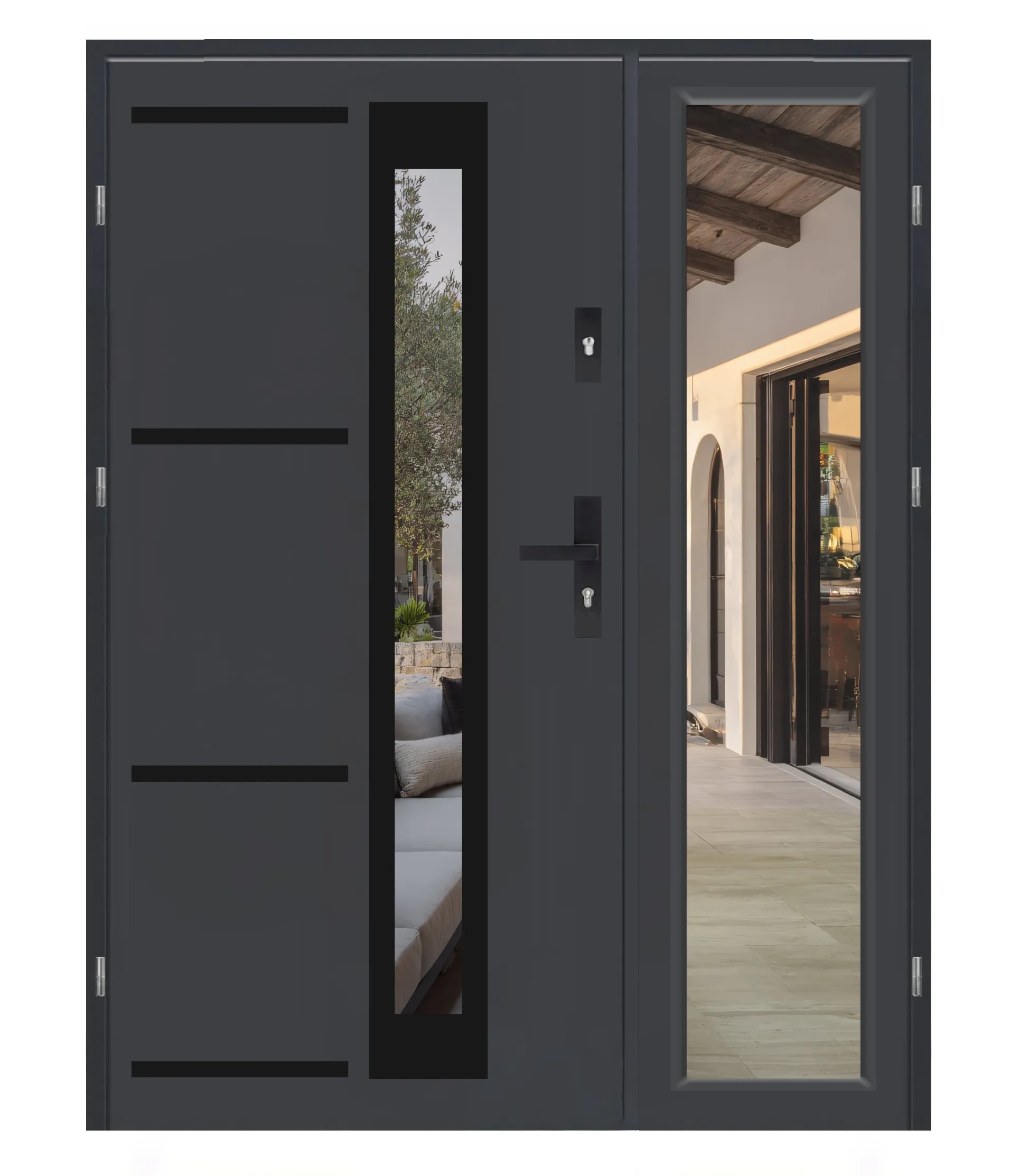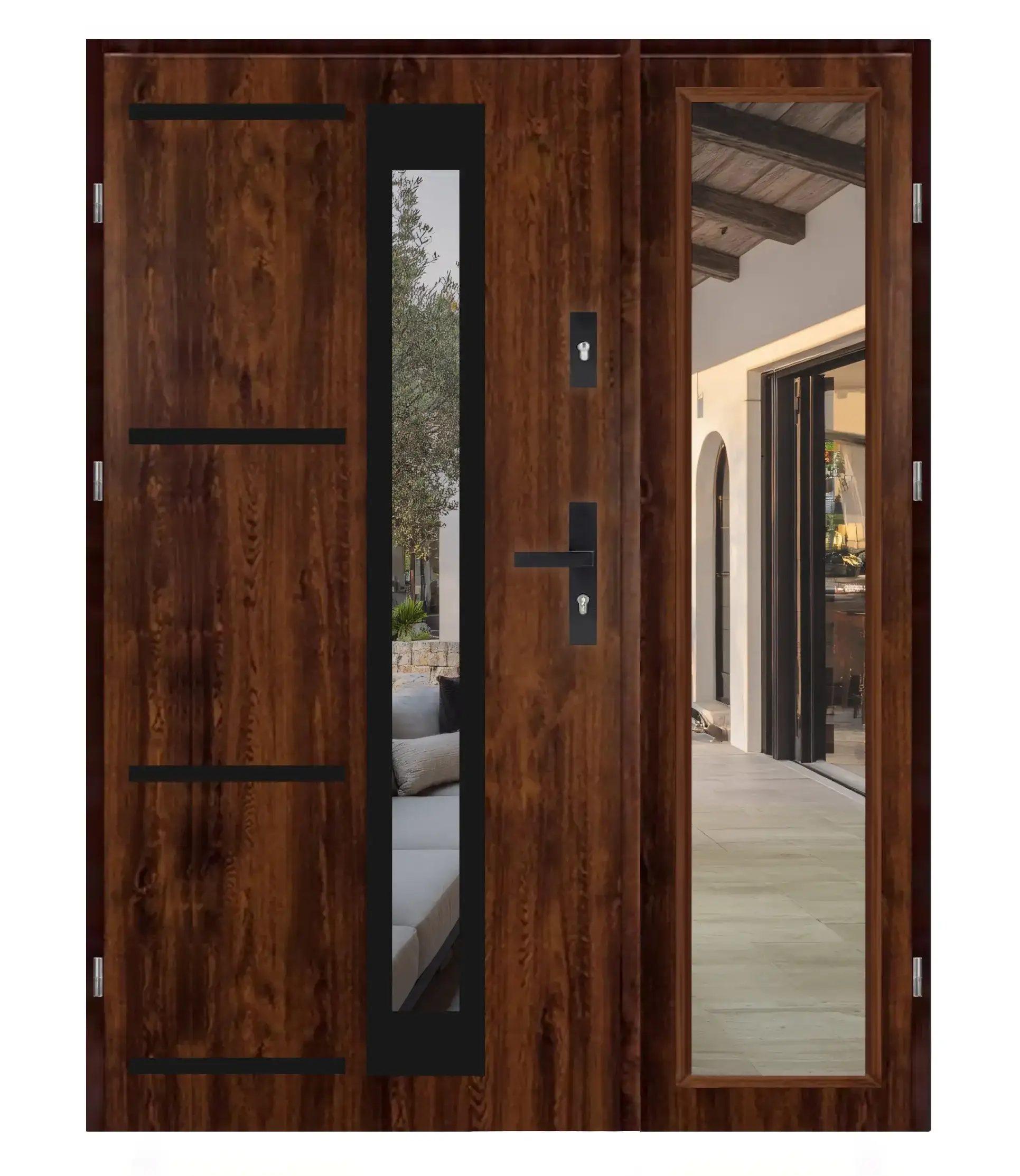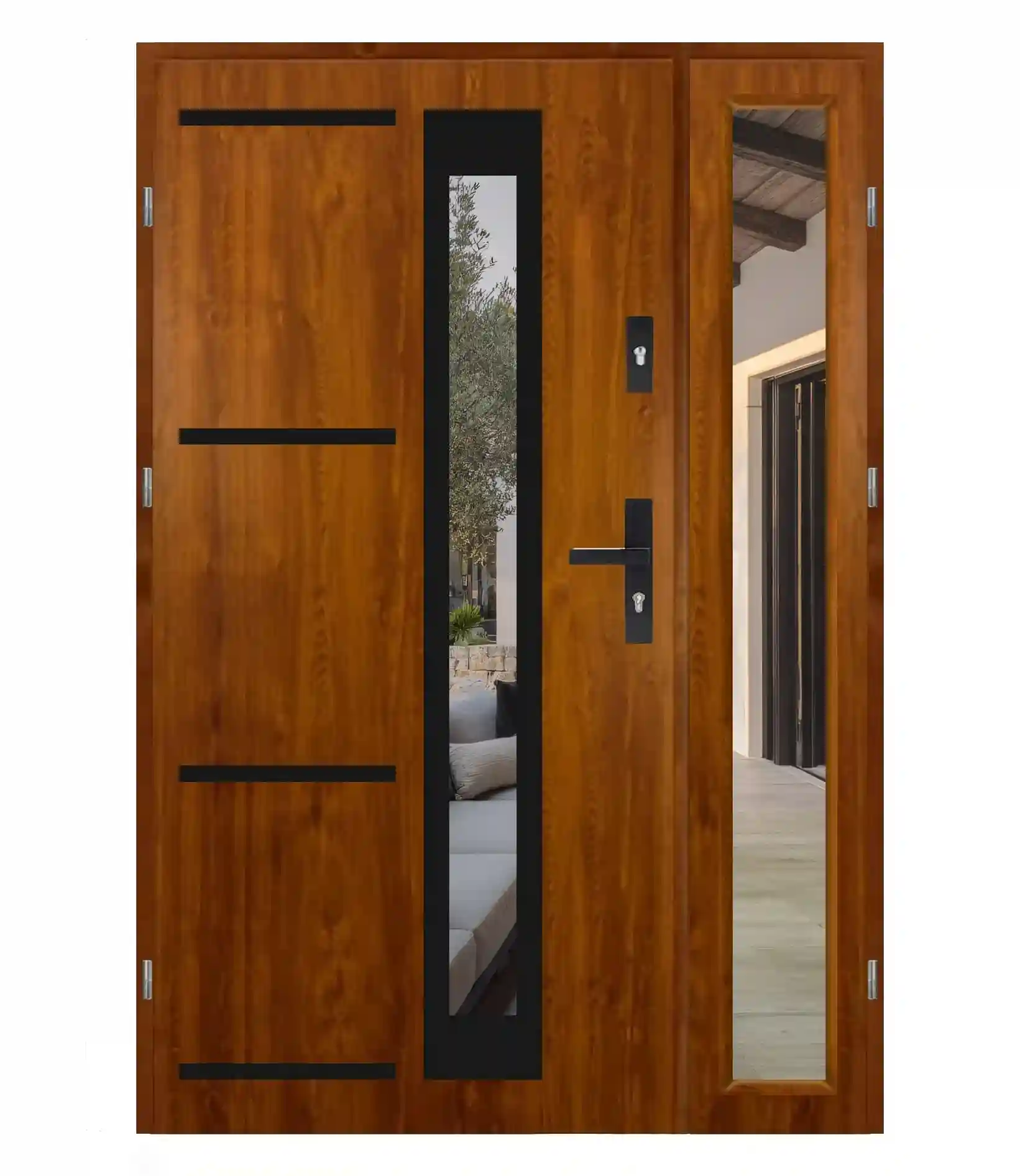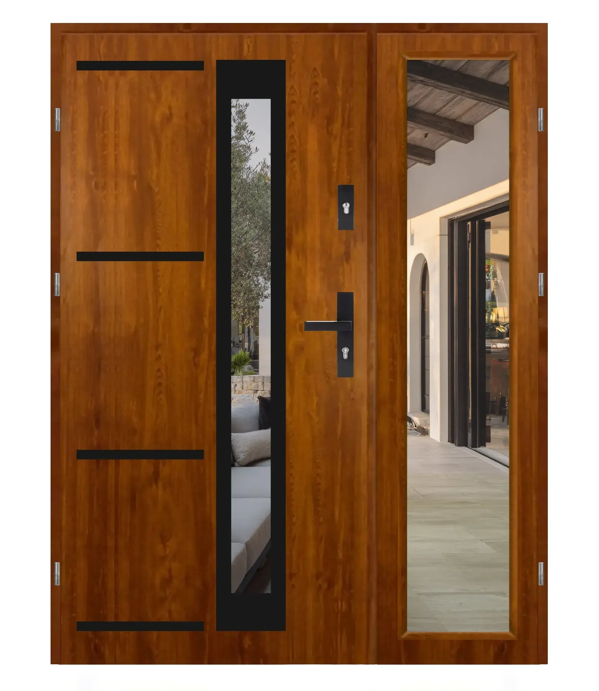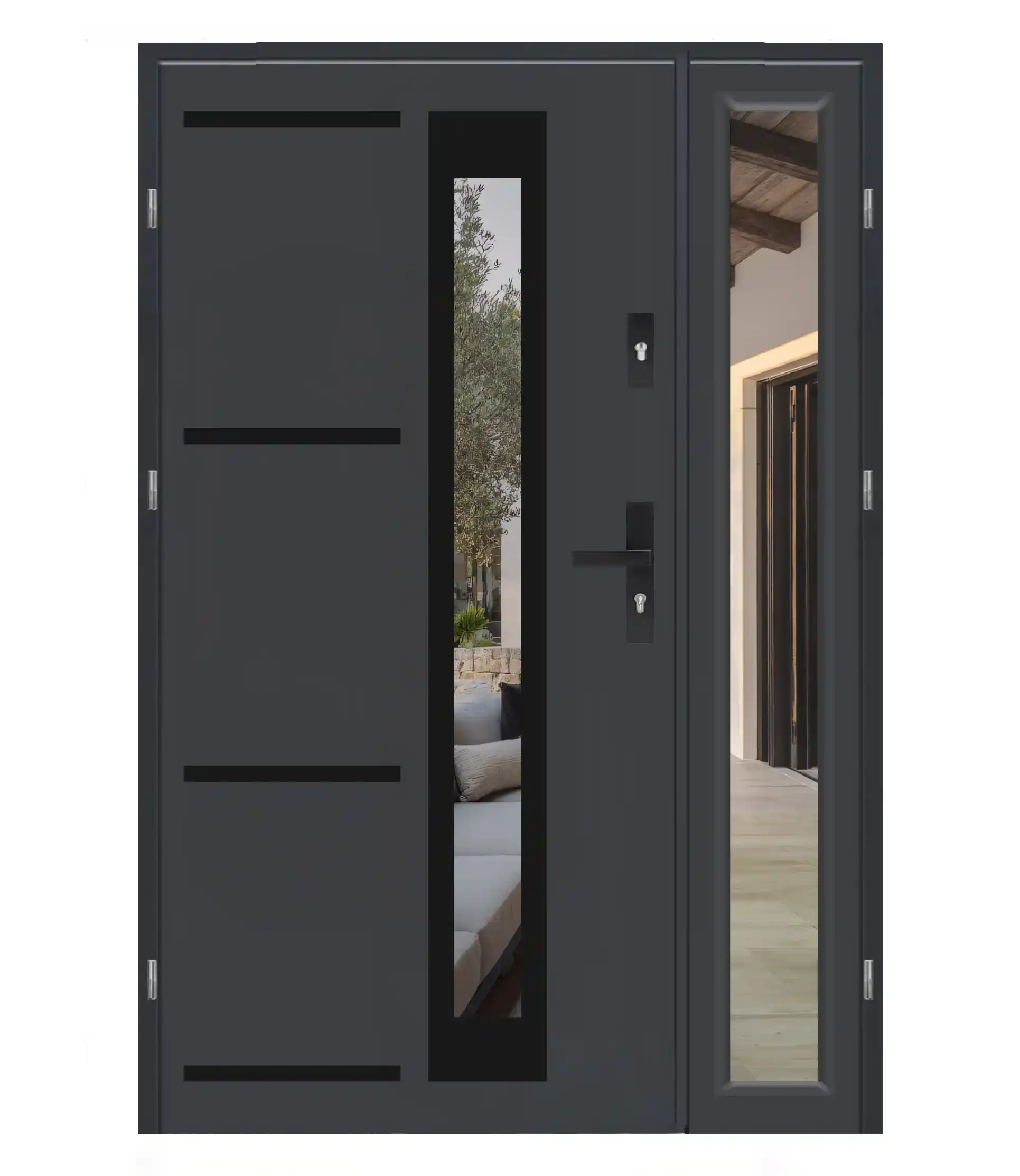 Wygląd elementów takich jak proporcje skrzydeł, rodzaj szyb, szerokość naświetli (przeszkleń), czy detale wykończenia może się różnić w zależności od wybranego modelu oraz konfiguracji (np. wymiar, typ drzwi, wersja techniczna).