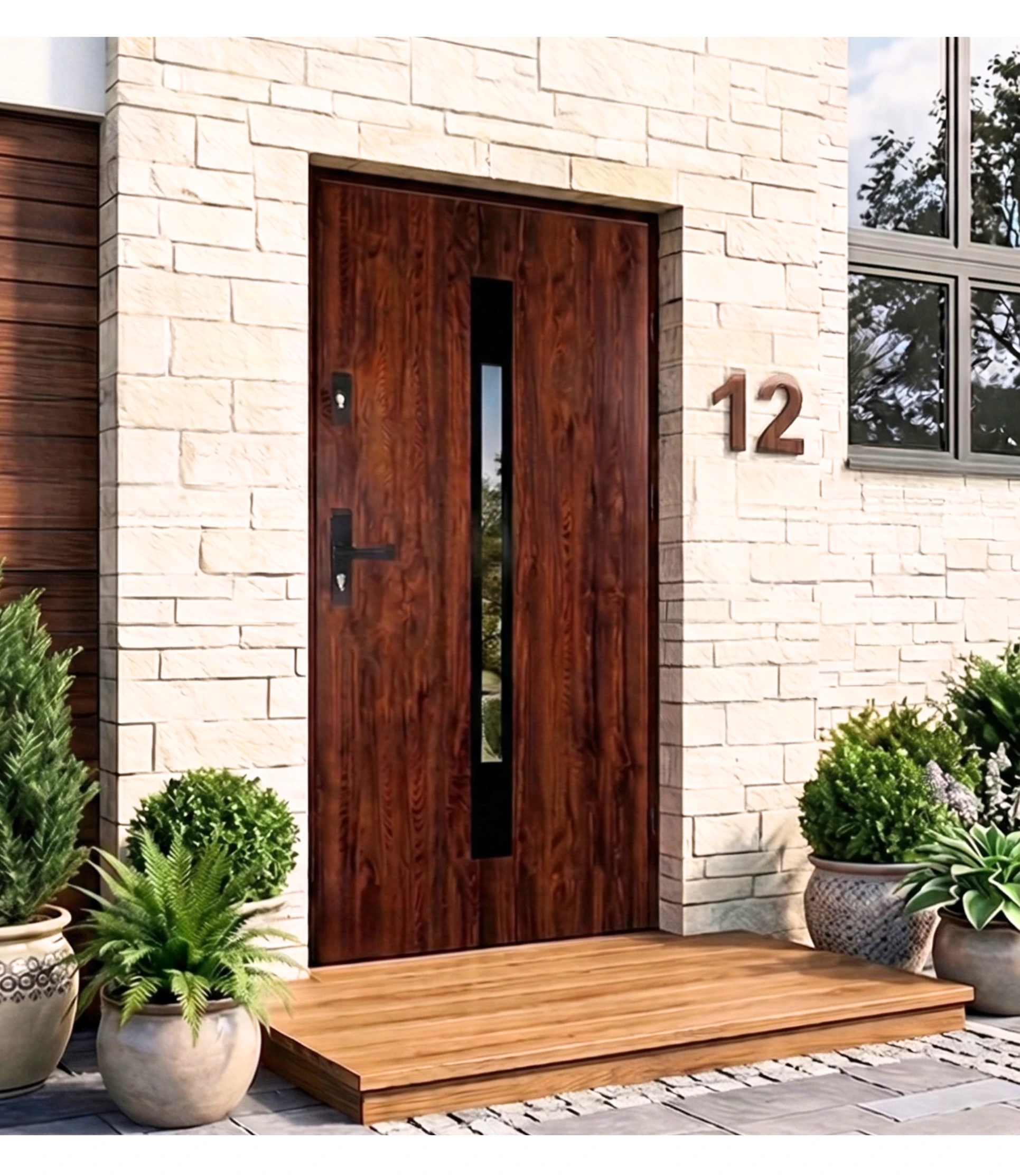 Nowoczesne drzwi zewnętrzne ocieplane o grubości 68 mm produkowane w Polsce. Grubość skrzydła oraz jego konstrukcja pozwoliła na osiągnięcie satysfakcjonującego współczynnika izolacyjności akustycznej i cieplnej.