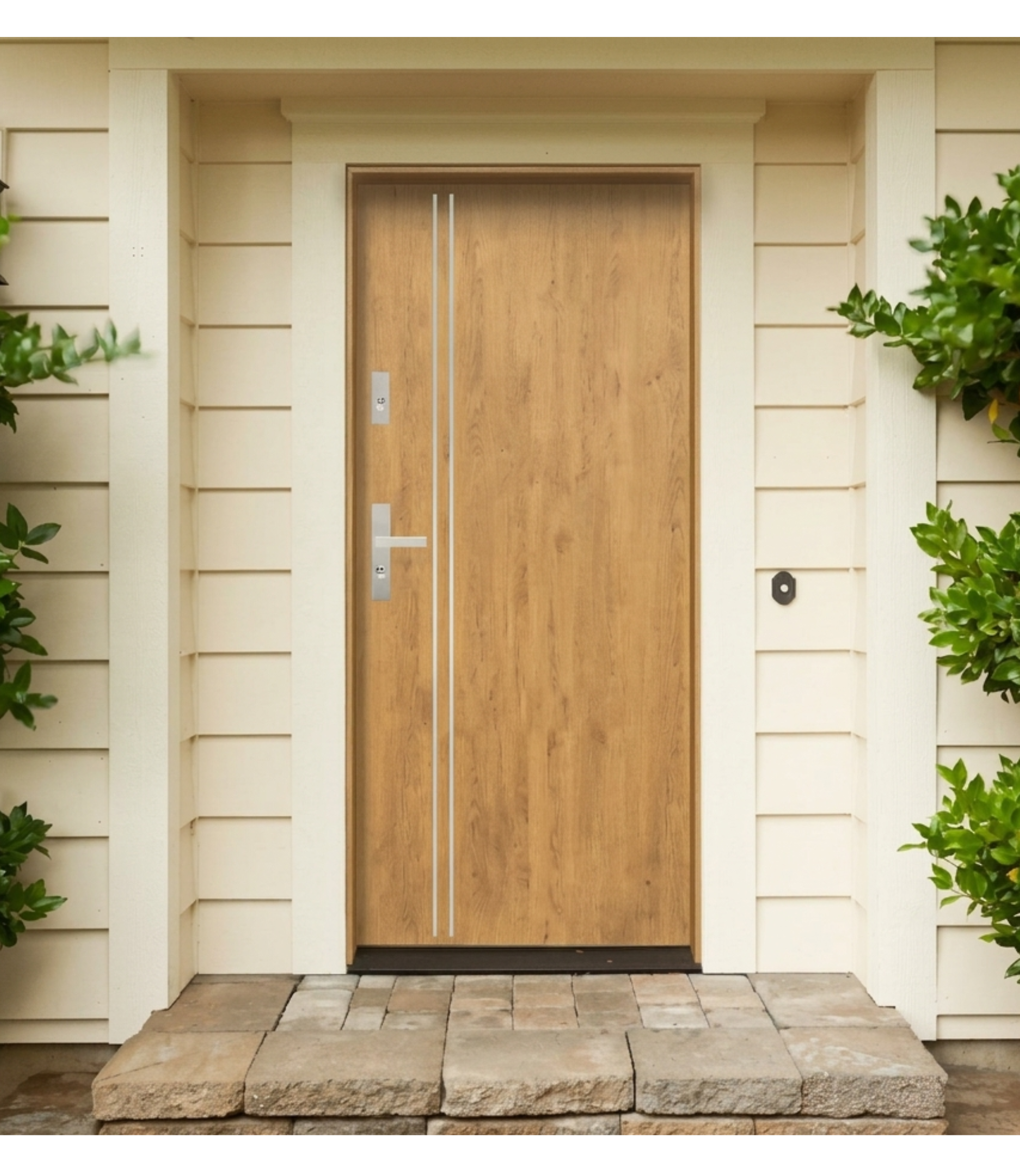 Nowoczesne drzwi zewnętrzne ocieplane o grubości 68 mm produkowane w Polsce. Grubość skrzydła oraz jego konstrukcja pozwoliła na osiągnięcie satysfakcjonującego współczynnika izolacyjności akustycznej i cieplnej.
